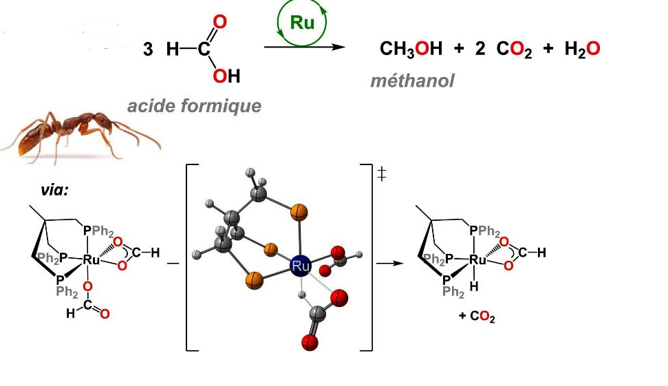 Cette réaction permet donc de former du méthanol et deux molécules de CO2 à partir de trois molécules d’acide formique à l’aide d’un complexe de ruthénium.